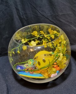 This Wellbeing Kit includes 1 fishbowl, 1 stem of Dancing Lady Orchids, 1 Smiley stress ball, 1 RUOK? wristband (with 4 steps on reverse side), 1 set of DIY Origami Lucy Stars (with instructions and QR code to YouTube tutorial), 2 packs of Post-it-Note for recording positive and negative emotions (with instructions), 3 packs of fun-sized chocolate bars (may vary) and 1 keyring of Community Flower Studio Logo.